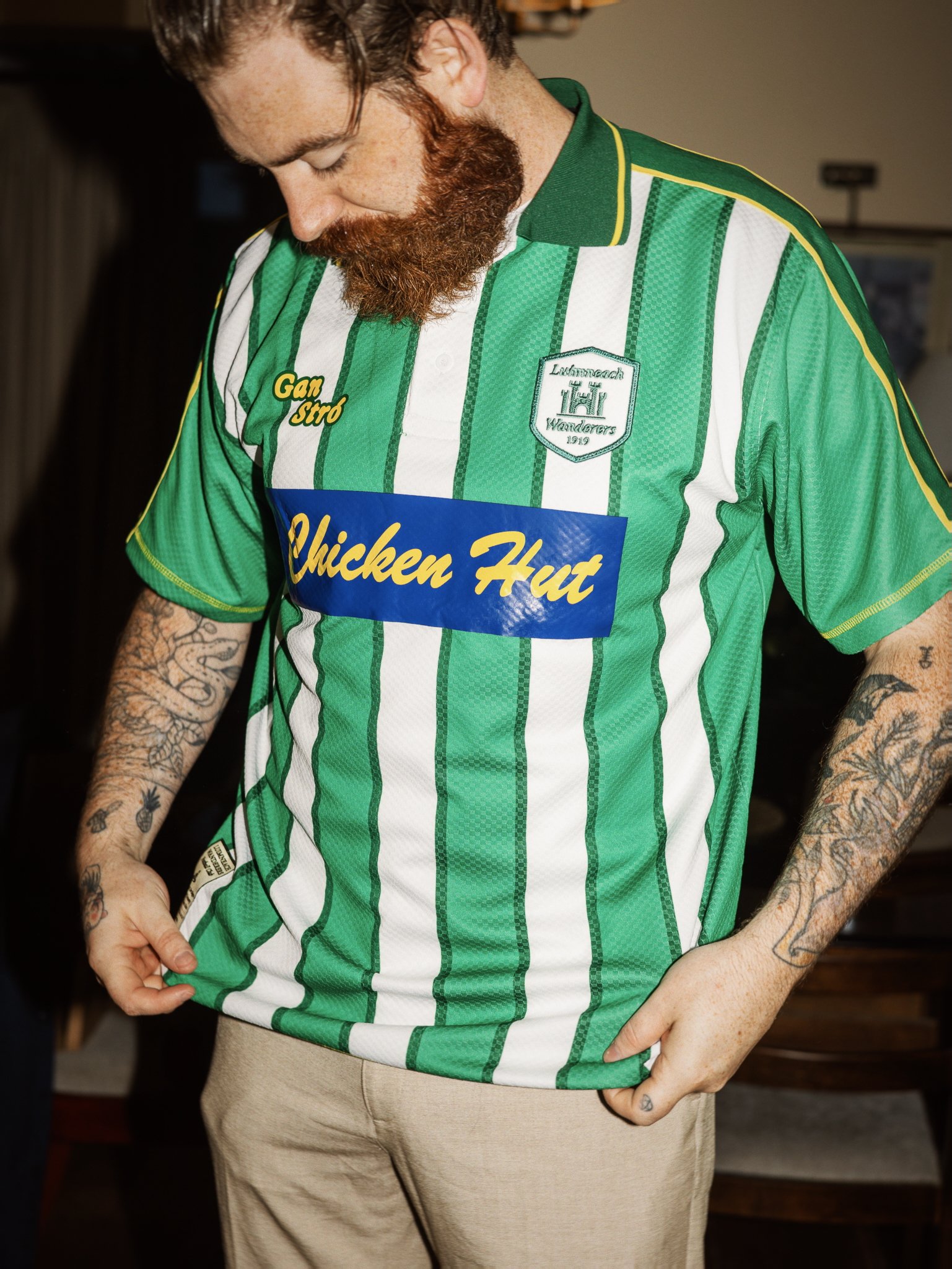 A gorgeously textured home kit for the fictional Luimneach Wanderers, from the not so fictional but equally gorgeous Limerick cityyy, kid. Emblazoned with the island's finest chicken house - Chicken Hut.